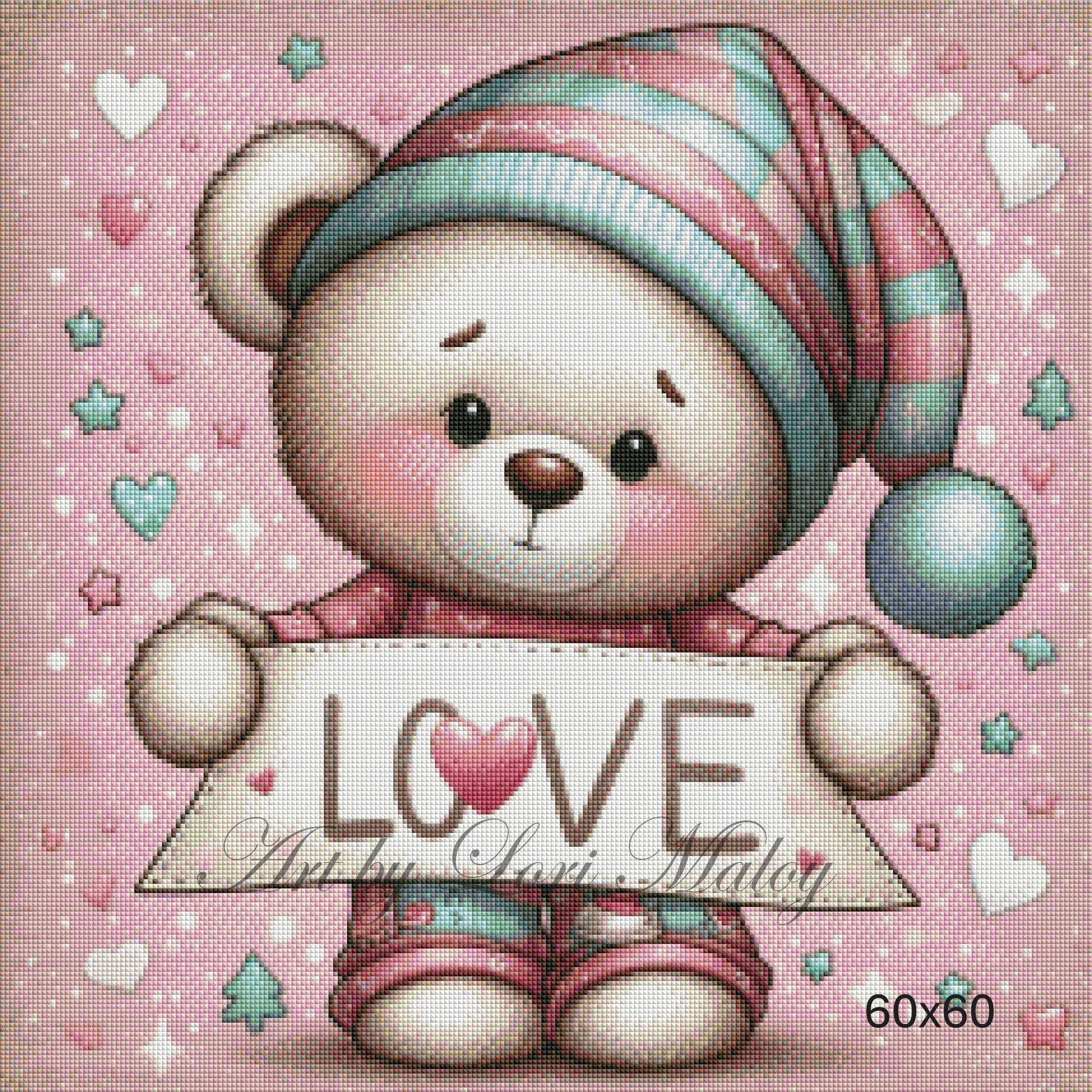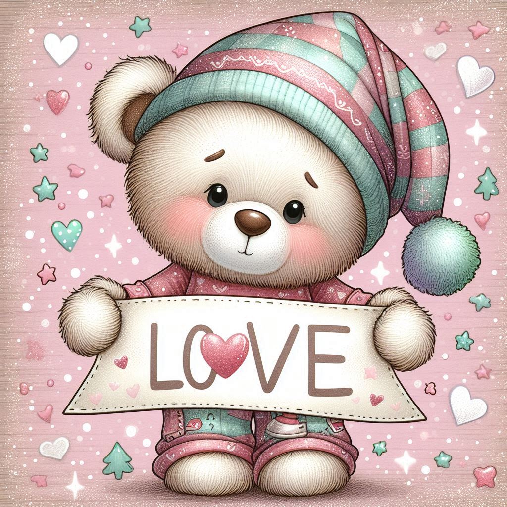 This textured teddy bear radiates warmth, holding a “LOVE” banner with a grin that feels like home. The subtle details—tiny stitched paws, blushing cheeks, soft brushed fur—invite you closer, reminding you that the sweetest messages are often the simplest.