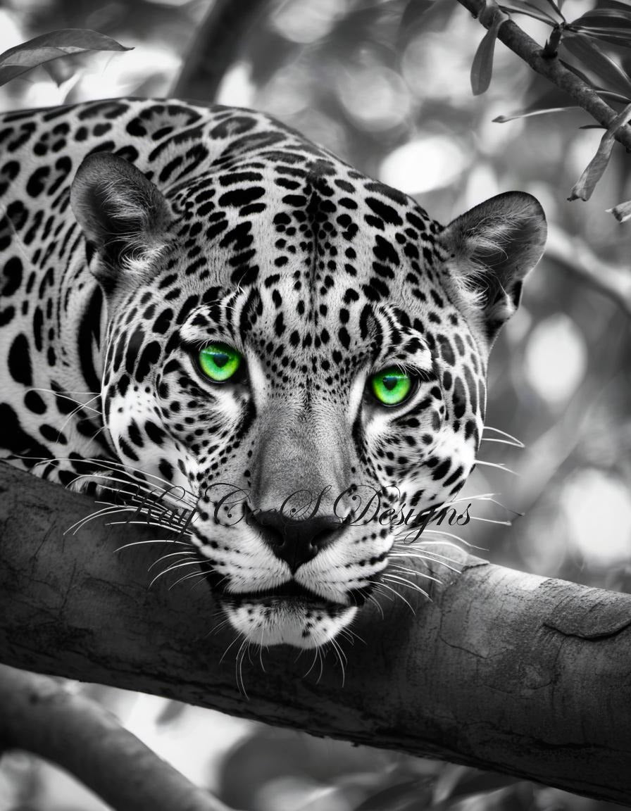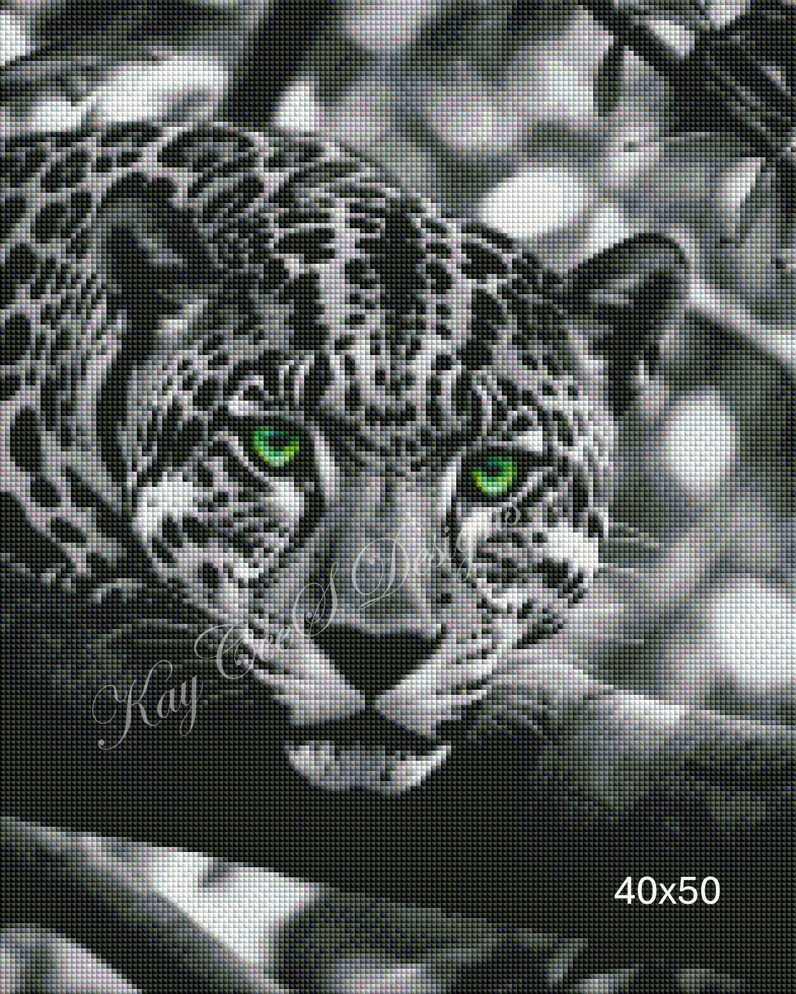 Lock eyes with the wild. Emerald Gaze of the Leopard captures a breathtaking moment of quiet power—a majestic leopard resting on a branch, rendered in striking black and white while its vivid green eyes glow with intensity. The high-contrast design highlights every intricate spot and whisker, making this piece especially stunning once completed in sparkling drills.