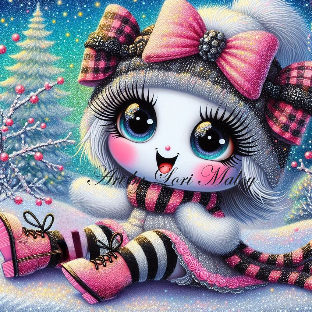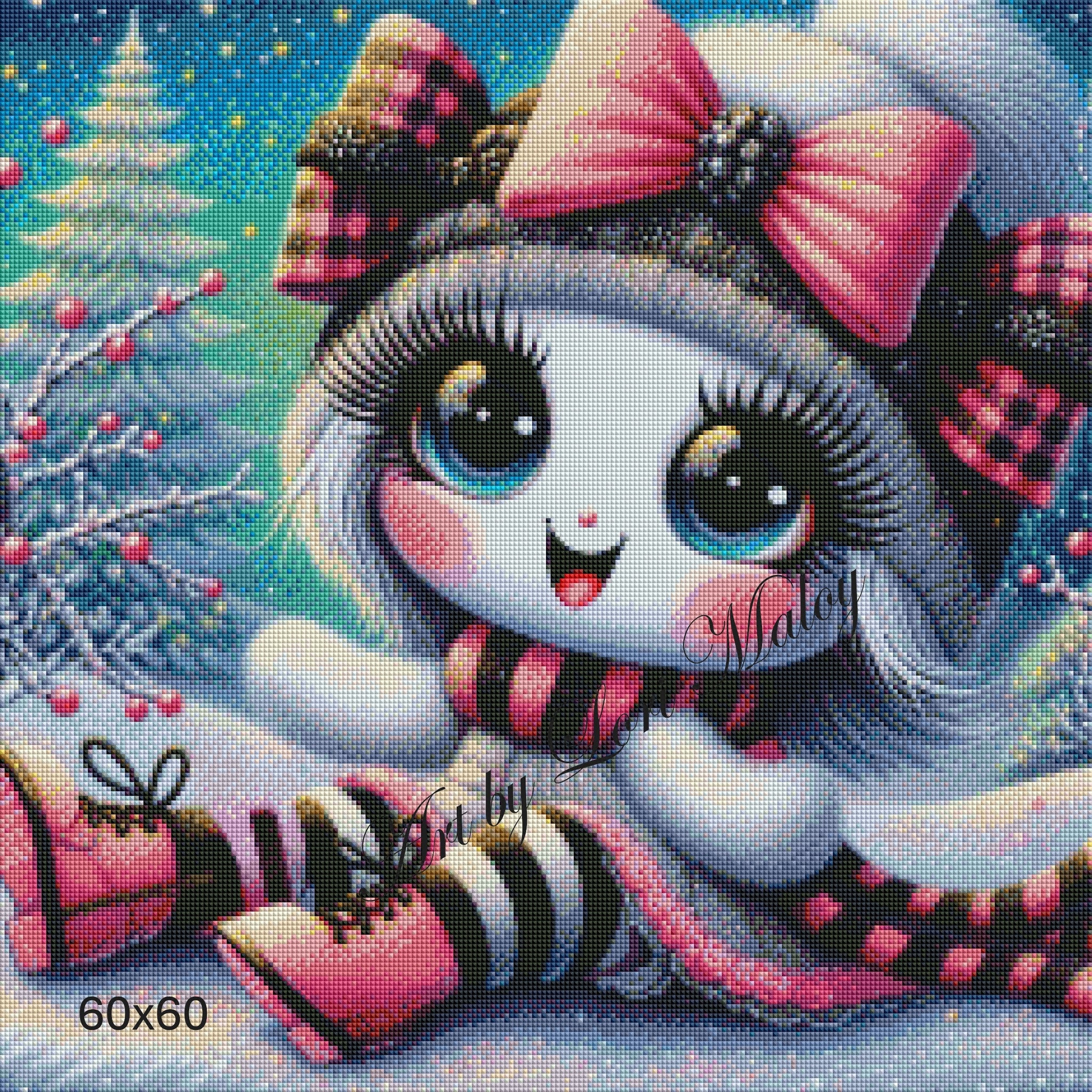 A chibi snowgirl dressed cutely for the winter snow, with bright eyes and rosy cheeks. Her joyful smile lights up a soft, snowy landscape, spreading cheer in every sparkling flake.