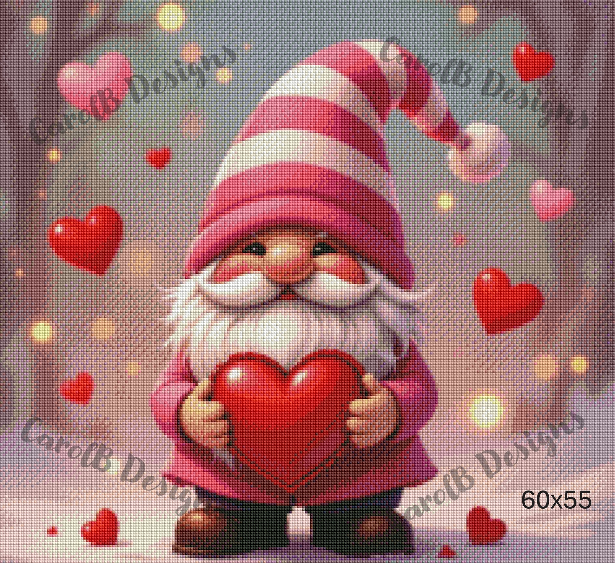 A cute little gnome in pink winter clothes holds a big red heart, surrounded by floating heart decorations in a soft, snowy scene.