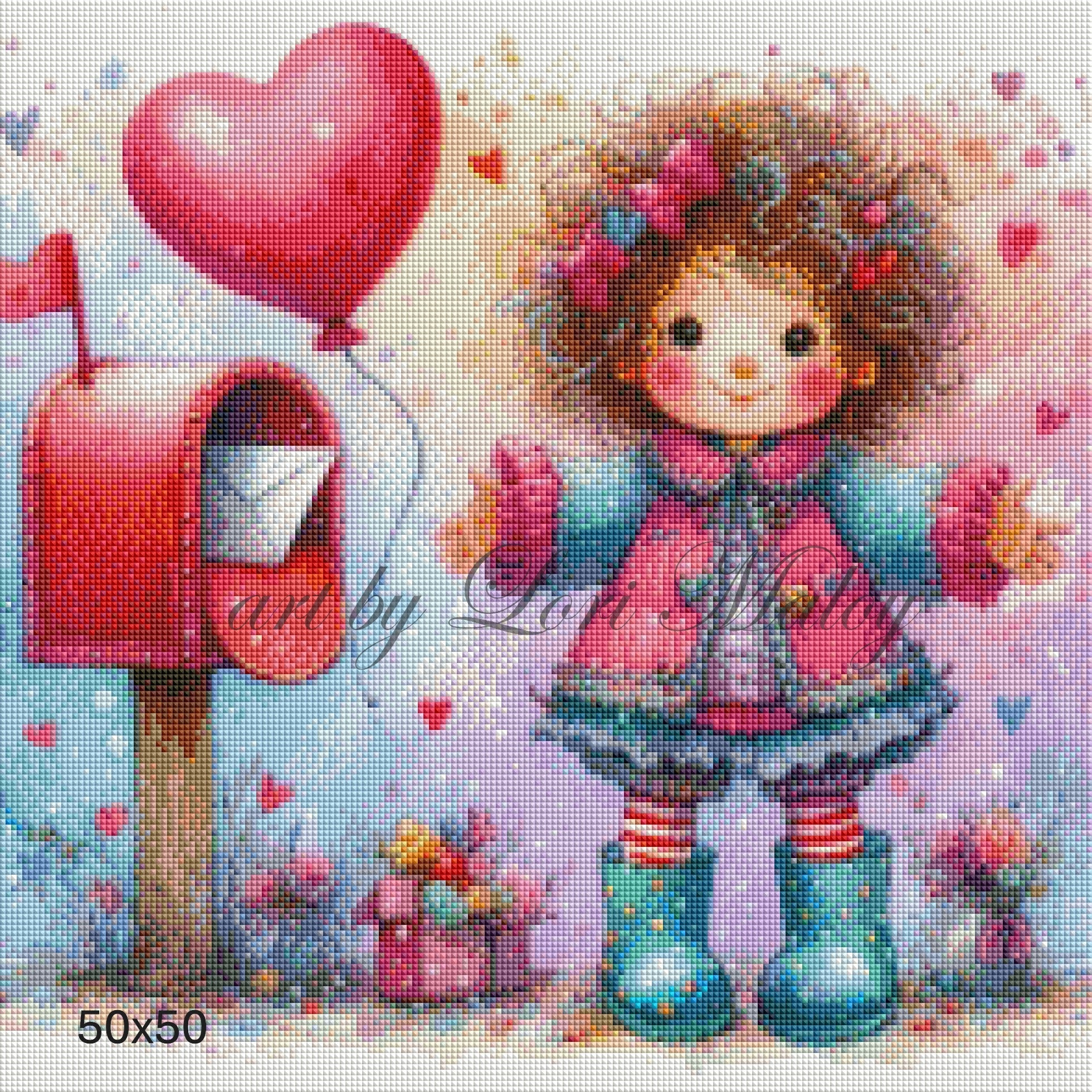 A simple, sweet scene of a girl at a mailbox with a valentine tucked inside. Soft pastels give the artwork a light and whimsical charm for diamond art.