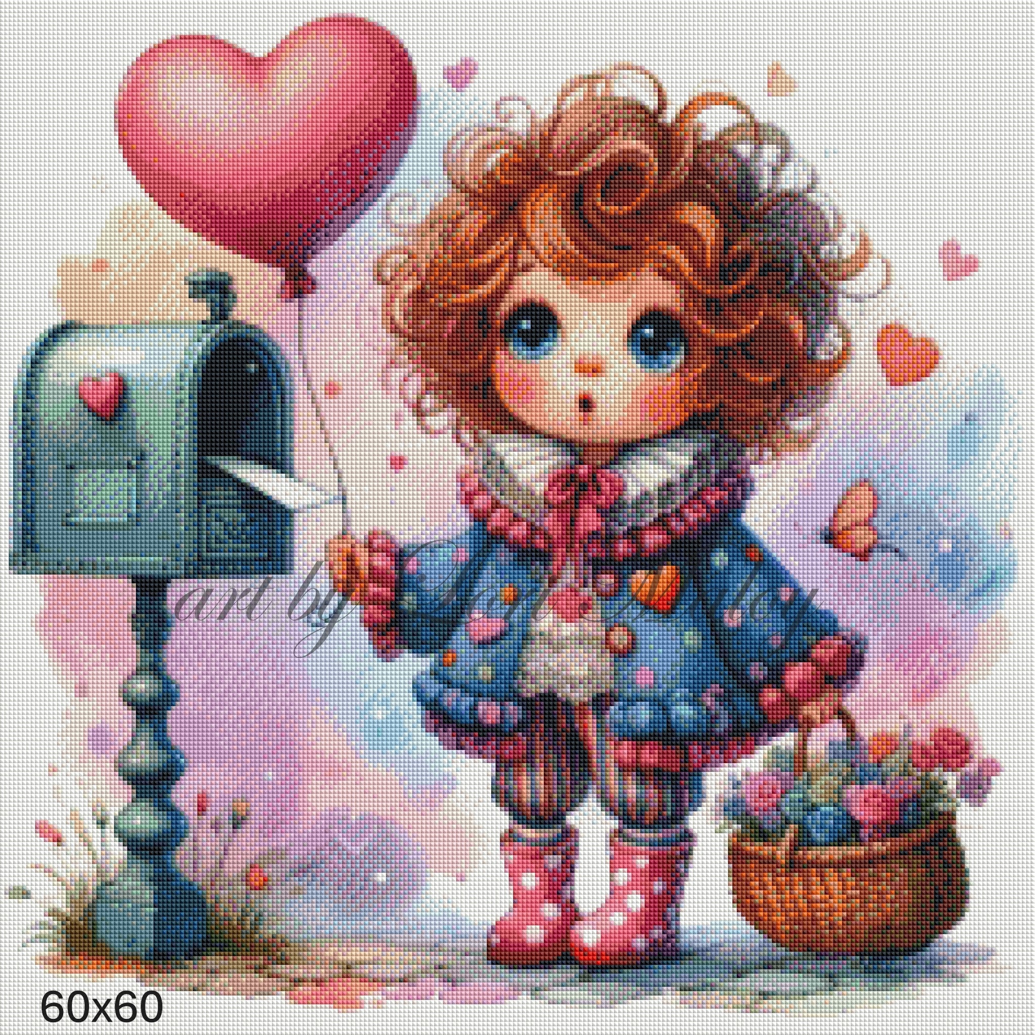 A girl pauses at a mailbox, spotting a valentine waiting for her. A pastel backdrop adds a soft, whimsical touch suited for diamond art prints.