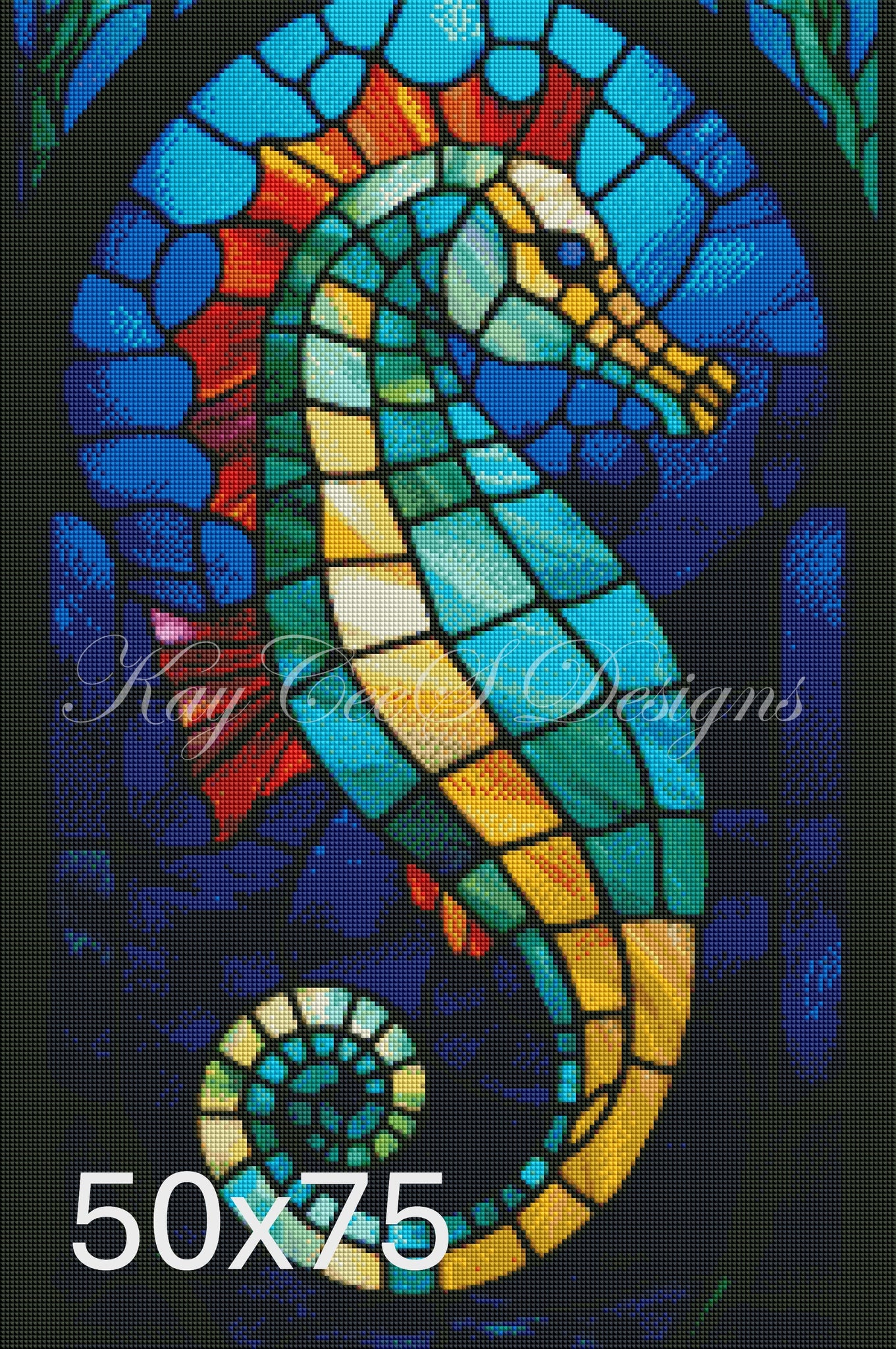 Inspired by the timeless beauty of stained glass art, this mesmerizing diamond painting features an elegant seahorse formed from luminous mosaic panels in shades of turquoise, gold, coral, and deep ocean blue. The graceful curves and glowing colors evoke the feeling of sunlight filtering through an underwater cathedral, creating a sense of wonder and serenity. Each sparkling drill enhances the glass-like effect, making this piece truly shine once completed. Perfect for ocean lovers and fans of unique, artistic designs, this diamond painting becomes a striking statement piece that brings coastal magic and refined beauty into any space.