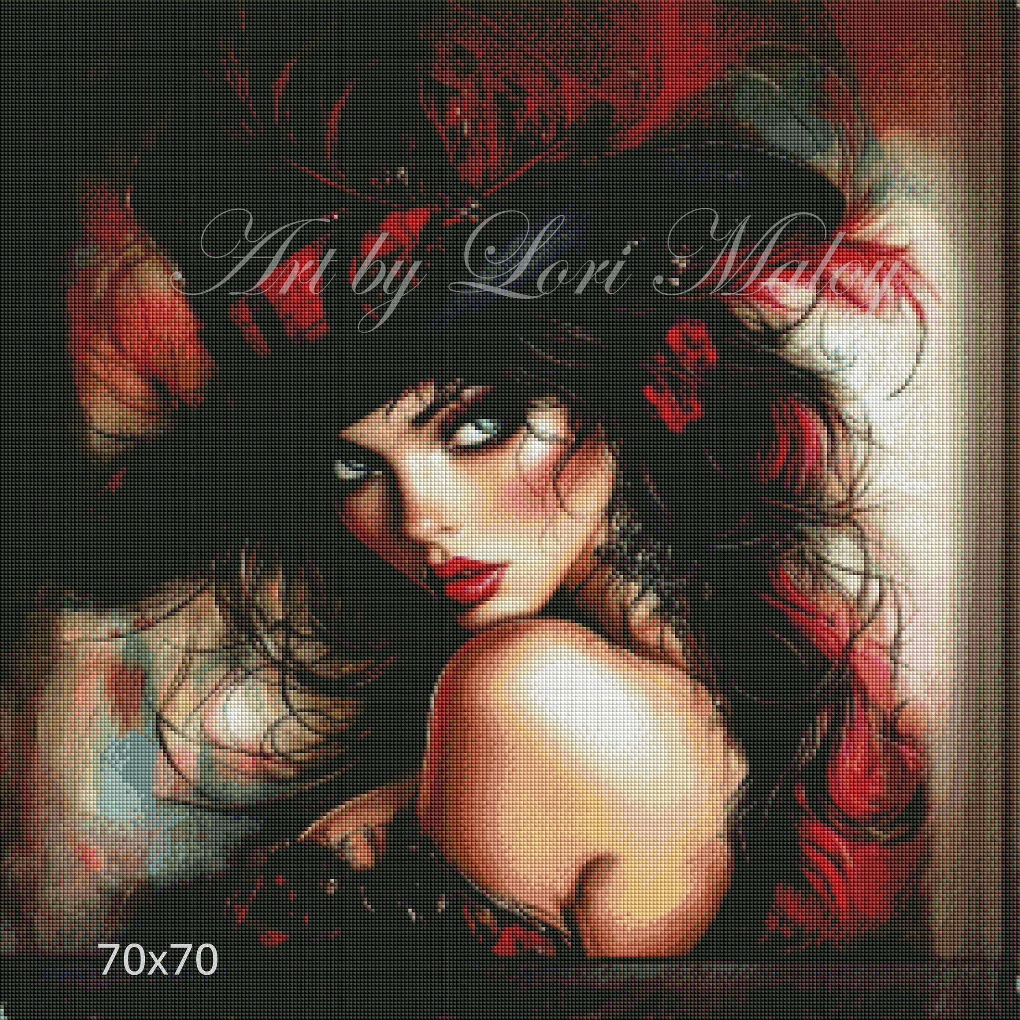 A sultry portrait of a woman draped in deep reds, her hat casting a shadow that hints at mystery and allure. Every line and fold in her plaid wrap echoes quiet sophistication, capturing the essence of soulful elegance. A digital artwork designed to stir the imagination and enrich your space with subtle, smoky charm.