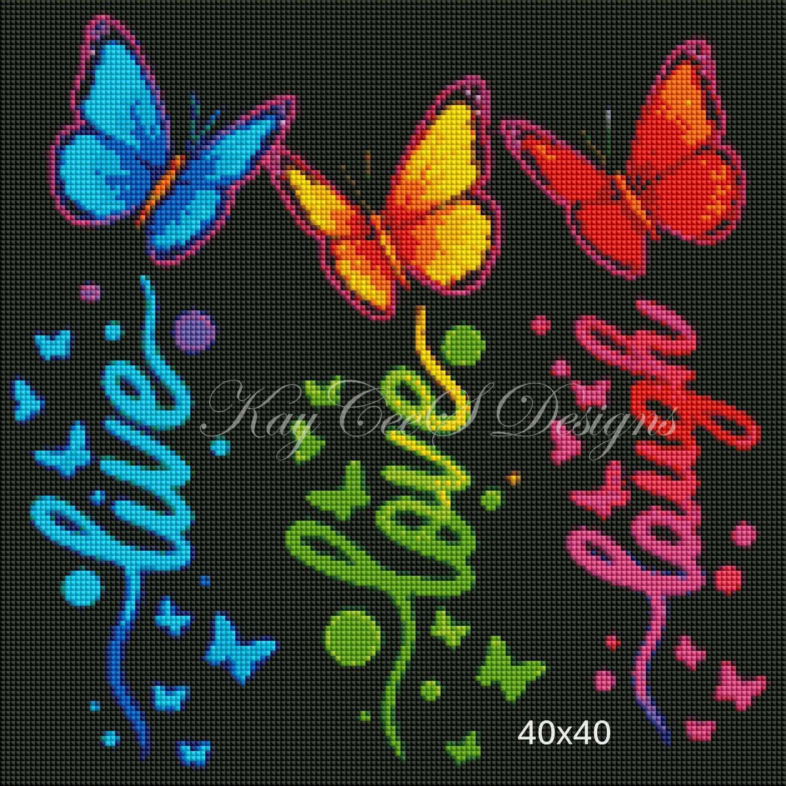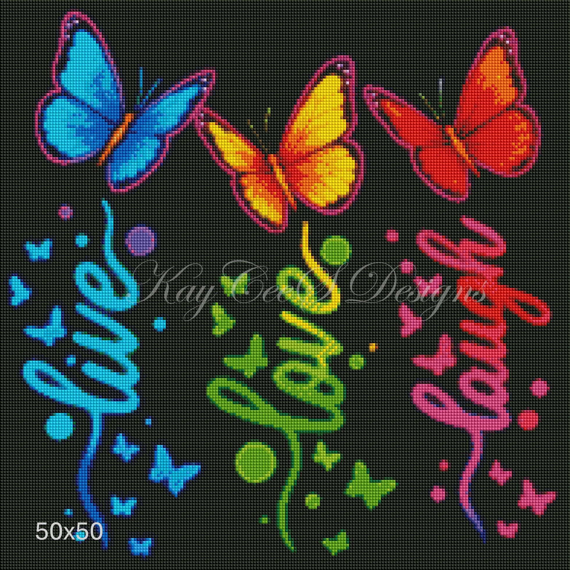 Bursting with bold color and glowing charm, this vibrant diamond painting kit brings the uplifting trio “Live, Love, Laugh” to life in dazzling neon style. Three radiant butterflies—cool blue, warm yellow, and fiery red—flutter above each word, their wings glowing like illuminated artwork against a deep black background.